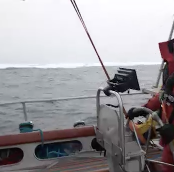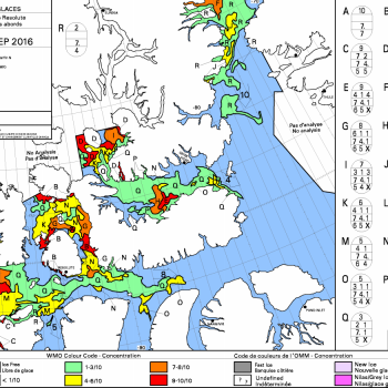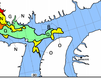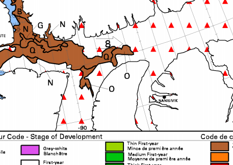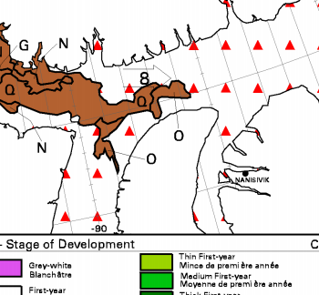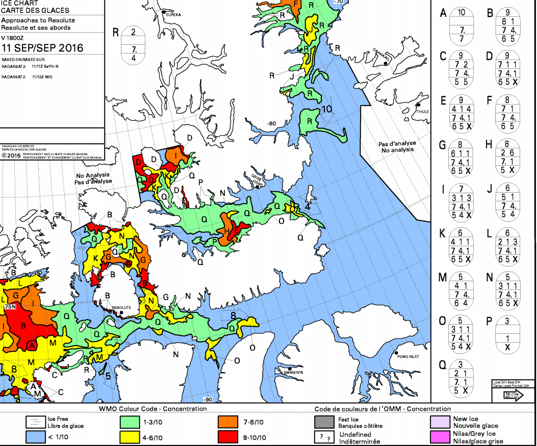 The ice charts are showing that we are going to have difficulty getting round the top of our channel into Lancaster Sound and the ice is moving towards the coast so it is getting harder. A section of the ice chart from 17:00UTC