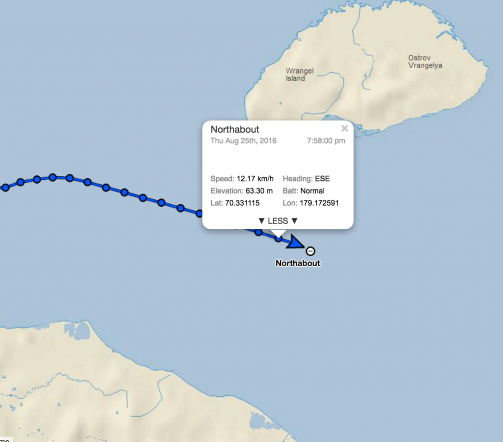179 degrees. This is agony. We have less than sixty miles to until we’re half way round so of course everything seems to be going much much slower. It’s not though. We’ve got the genoa out for the first time in weeks and have been going along at over seven knots over the ground. The weather has been good, wind but not too cold, although, you remember that current that was supposed to help us through the East Siberian Sea? All and I mean ALL, of the experimental evidence that we’ve encountered supports the conclusion that it just doesn’t exist. If it did we’d be going over eight knots, so I don’t know what we’re doing wrong but it’s frustrating. I am really looking forward to Point Barrow. It’s not that it’s a particularly exotic place, I’ve been to America before and I’ve been further north before. The reason it’s exciting is because all I’ve seen for the last month has been Russia, and the Russia I have seen is massive, bleak and sameish. The North West Passage is apparently much more interesting. I hope so, I’m bored with constant brown moors, we’ve had them for the last four thousand miles. In order to catch up with Alaskan time we’ve changed the clocks I’m now doing the two till six watch rather than the six till ten. In reality the only effect this has is when it’s dark the clock says it’s midnight rather than six in the morning. If we’re lucky it should take us four days to reach Barrow. I think that there is where the North East Passage finishes, not long now, bye.