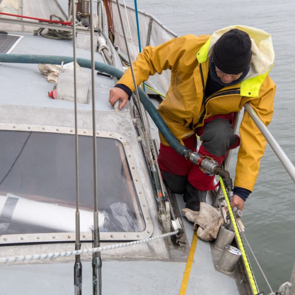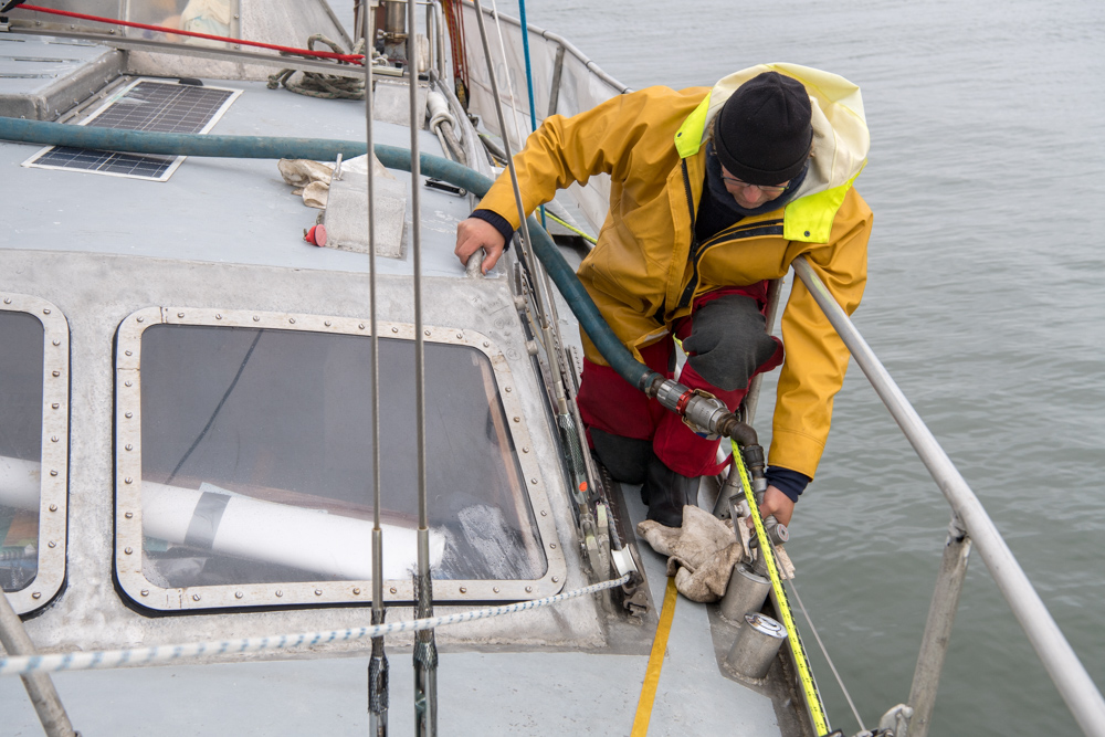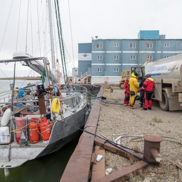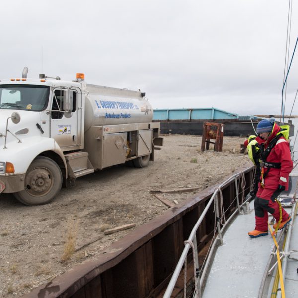 Arriving and refuelling our emergency fuel stock. Rick the truck driver kindly stayed after work especially because we arrived after hours (and on a holiday weekend!). Doug Saunders kindly let us stay moored at the pontoon at E. Grubens transport depot.