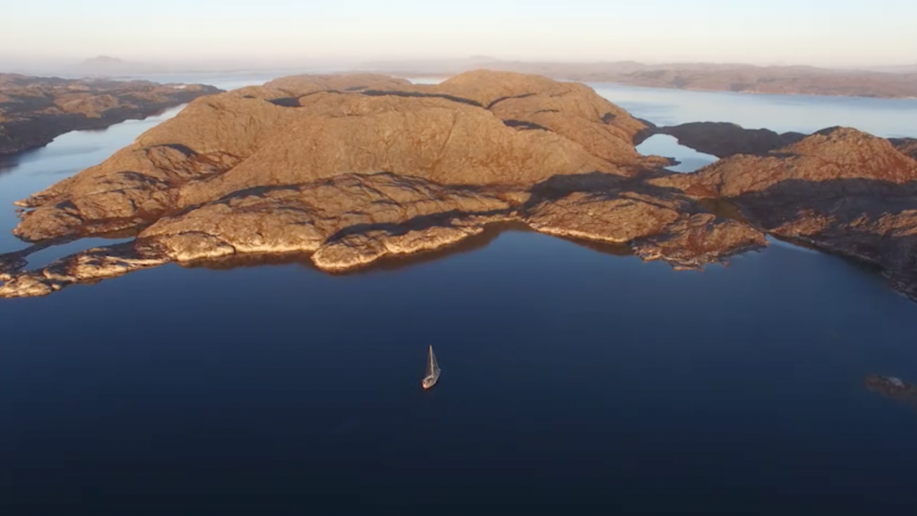 “After last night’s northern lights spectacular I woke this morning in this cold remote anchorage to the sunrise and flat calm water. We feasted on porridge, and then Steve flew the drone to capture the moment, and we upped anchor aiming for Julianehavn late this afternoon. We soon saw ice, but little need to take avoiding action. i stood in the while for a while and a whale was seen blowing a couple of times in the distance.