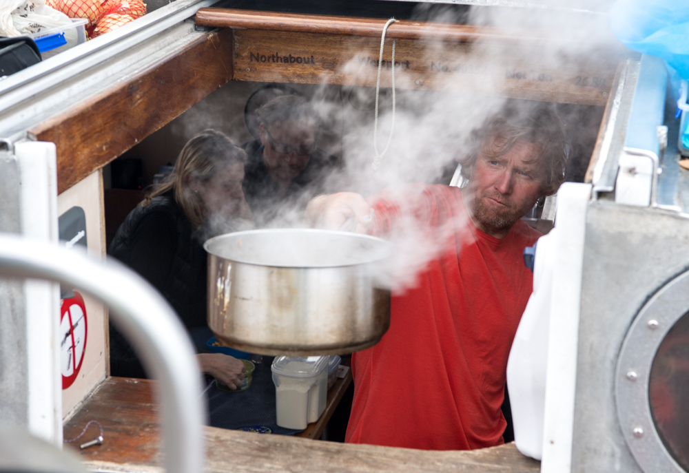 No swell as we are in an area with land all round, but in the head wind it is choppy and sometimes the bow hits the waves with a splash. Benji is trying to look cool on watch in the rain with the boat heading into wind. It is now pretty cold, wet and windy so saying cool is not a problem.