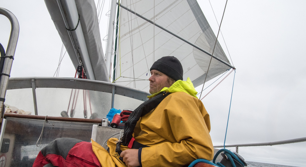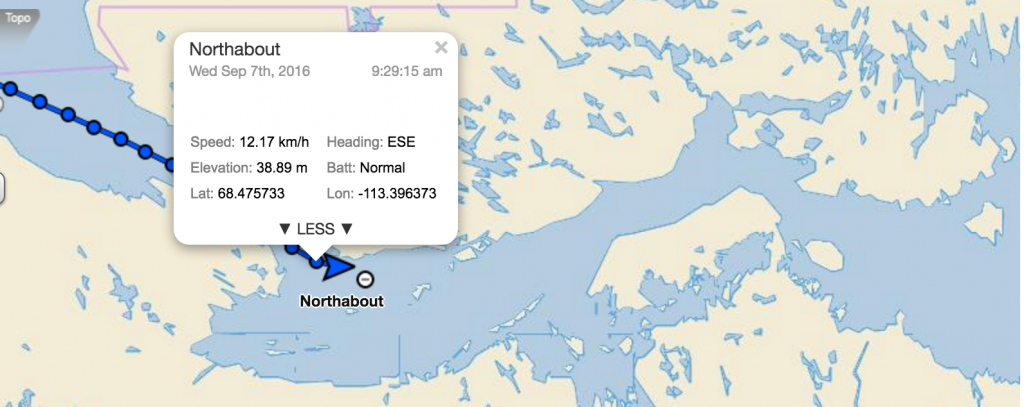 N68 24 w 111 54 Pressure 1009 water 7.8C, Air 0C 14:00 UTC 7th Sept Coronation Gulf No wind, took the main down and trying to get some help from a flapping genoa. Slowly making our way down Coronation Gulf. A few patches of blue sky,…