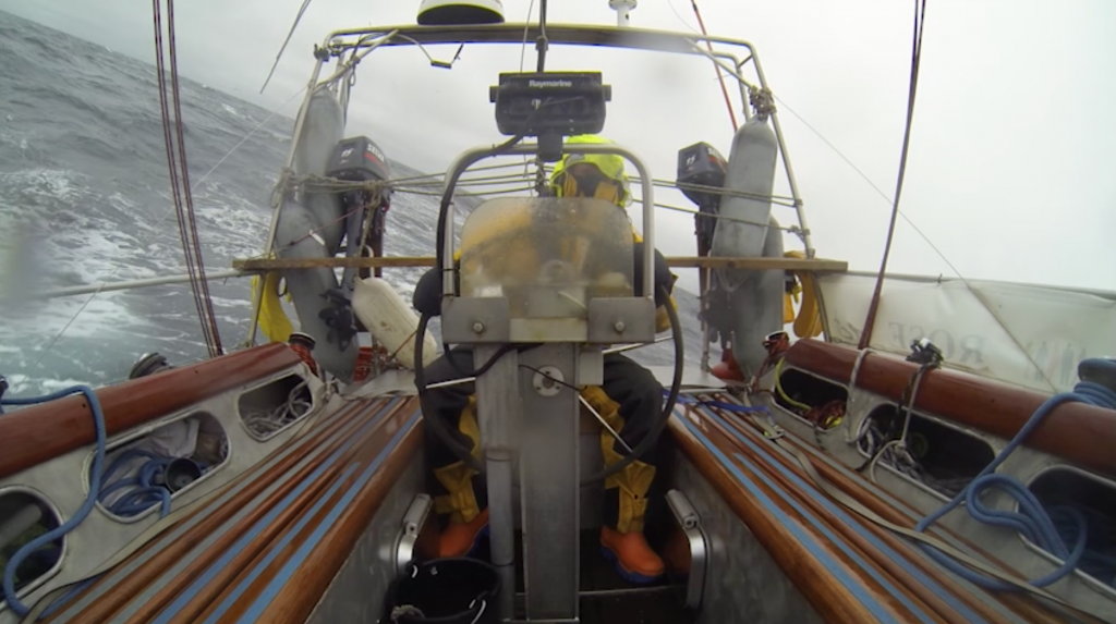 Anyway.  Yesterday we started sailing south east with a good wind and no particular hurry.  This wind then got out of hand.  By this morning we had a force 8 gale and waves with whiteheads that would have done a teenager’s face proud.  The waves and wind were strong enough that the autopilot couldn’t cope and failed to keep us going in a straight line.  It was up to us.  It was then that I realised that we were in trouble.  I did my evening watch.  Every half an hour we would switch out and you would go up into the cockpit, clip on, stand behind the helm and do everything in your power to keep the boat straight.  We had the main and staysails out, as such the boat was tipped over so you had to stick your leg out to stay in the cockpit when the waves came.  It was freezing.  As the shift went on I began to measure time by how much my fingers hurt from the cold…. We sailed on, the waves got higher, the wind got stronger and the waves began to break over the bow and smash into the saloon windows and the cockpit.  Cold water splashed into your hood and you were blinded for seconds at a time.  The wind pushed the boat and you were fighting the wheel to stay pointing in the same direction.  I finished my shift and tried to sleep.  The bow went up and down crashing into the waves with loud cracks and tilting so that any chances of sleep were dashed against the bulkhead as loose boots and boxes rocketed around the cabin.  Even in bed there was no escape from the icy spray of the sea.  There is a vent in the porthole at the front of the boat and as the waves come over they spill through onto the floor.  In the aft cabins spray water came in through unseen cracks and fissures in the hull.  Eight hours later I rose from my bunk for the morning watch.  Things had only got worse.   The boat rocked and the sea spray filled your vision.  David was helming when the weather reached its peak.  We approached a huge wave and as it filled the portholes’ views the boat come crashing down, we braced for it to rock back up, it didn’t.  The swell was too high and we didn’t go over.  The wave came over the foredeck, the saloon, the cockpit.  Were engulfed and for a second the entire boat was consumed by the massive body of water.  That second passed and the water roared off the decks as we plummeted into the trough on the other side.  Water had come through in a dozen places: vents, the companionway and poorly sealed windows.  But that was not my concern, I grabbed the cover of the companionway, pulled it back and breathed a sigh of relief.  David was still there.  Water would dry and we could place back any objects that had come loose but with a wave of that size the main danger was that David had been washed over while helming.  True I knew he was clipped in but all that really meant was that he could be being dragged behind the boat rather than be fully detached.  As luck would have it he’d been positioned so that he was braced against such an assault.  After that the weather began to calm, slowly, very slowly.  By the end of my watch we were still rocking about but things quickly calmed enough for me to write this.  Once I was finished I came below decks to dry off and I noticed something rather odd.  My face was completely covered by a thin crust of dried salt.  So things have calmed and what I hope was the harshest weather we will see has passed somewhat.  I am, I admit, relieved.