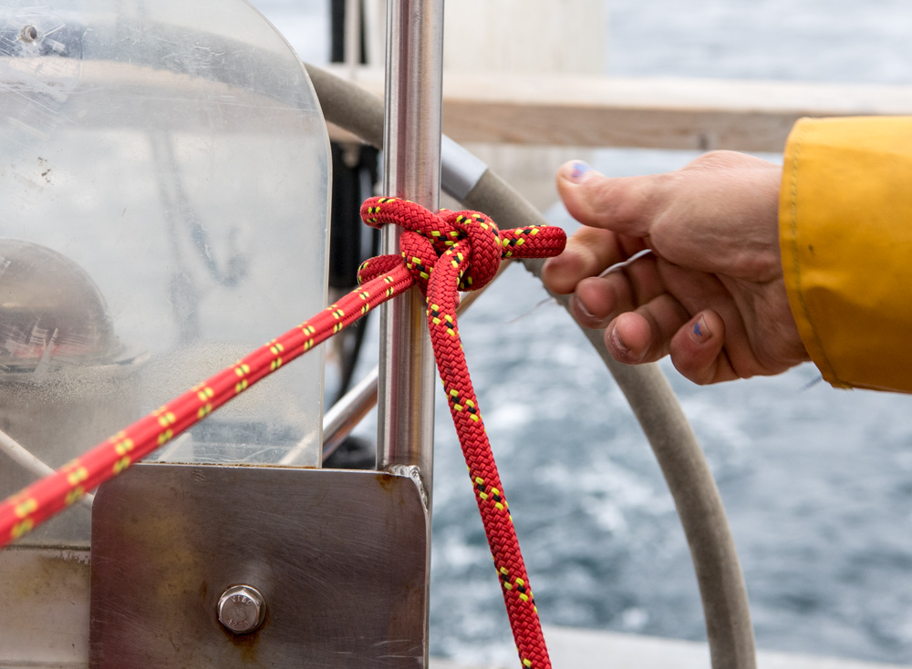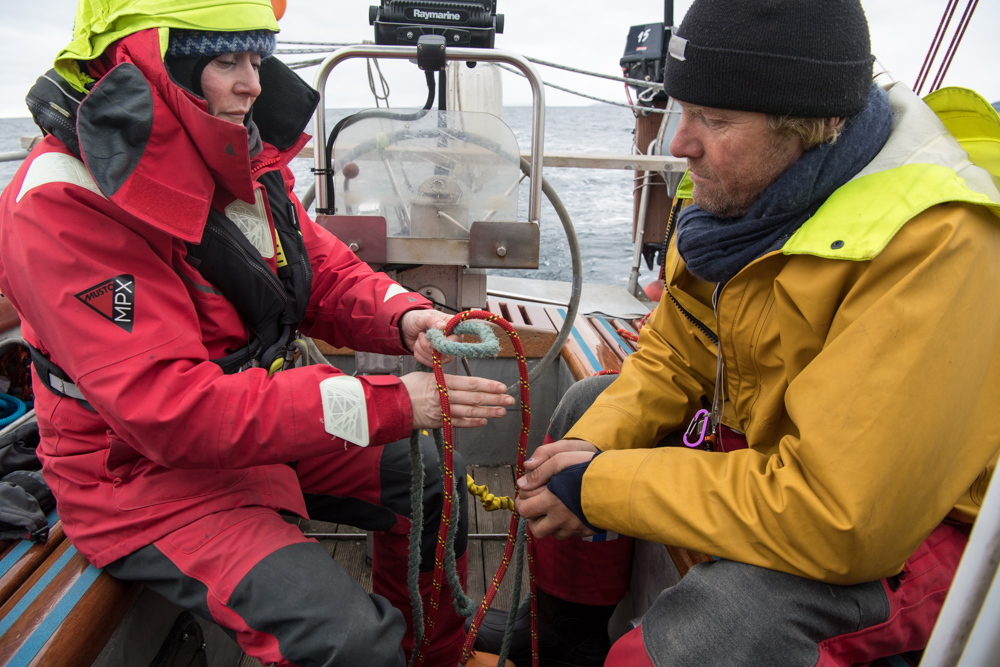 Knowing about the book several crew members have asked for knot training and the detail picture shows Barbara being shown a highwayman’s hitch, or in Norway a smuggler’s hitch. The point of this knot is that one rope is quite secure but can be released very quickly by pulling on the other rope. It was widely used by highwaymen for tying horses and by Norwegian booze smugglers in the 1920s. (Norway tried prohibition at the same time as the USA). In Norway most alcohol was smuggled by boat using towed torpedo shaped containers that would sink if not pulled along and could be released very quickly using this knot if the customs boat appeared unexpectedly.